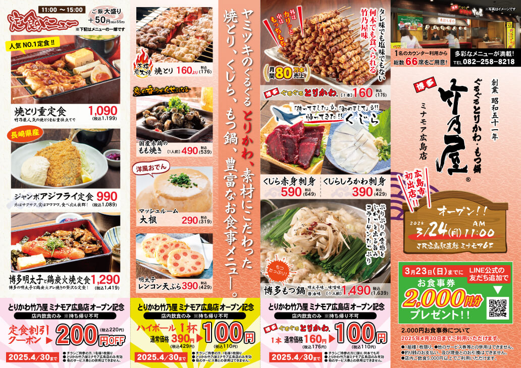 2025/3/10 新店情報【3月24日】竹乃屋 ミナモア広島店オープン! -